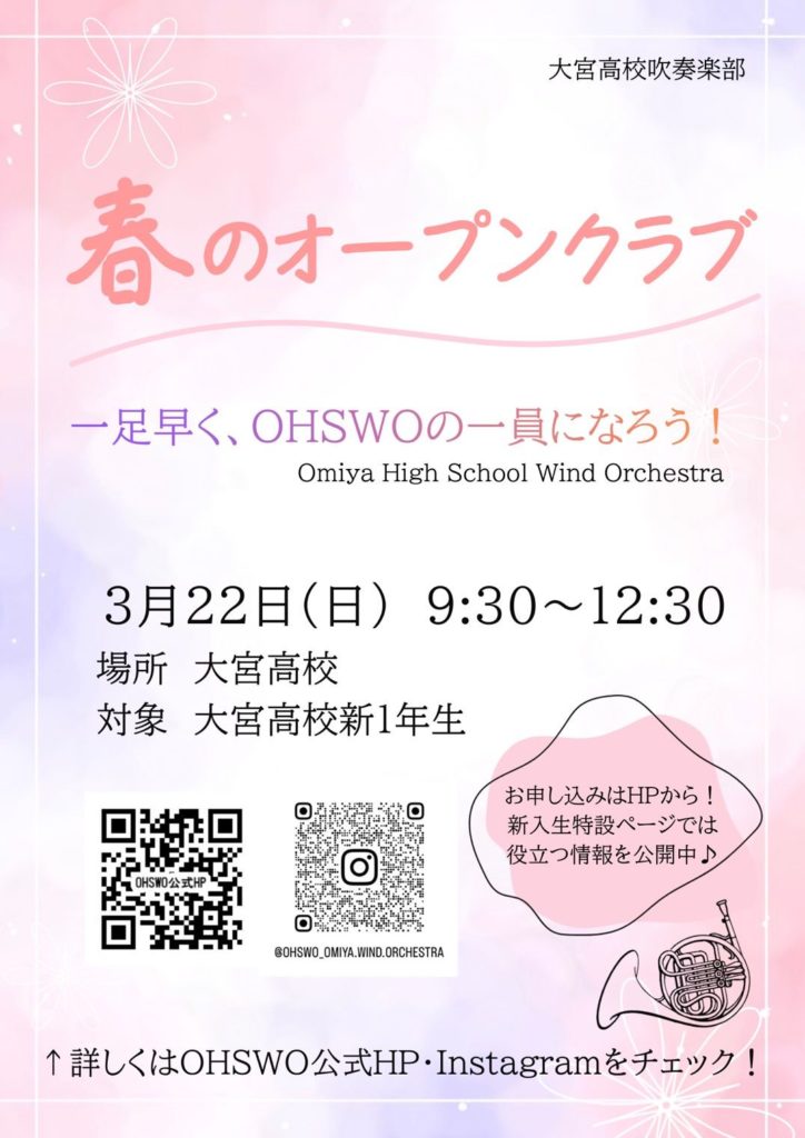 高校でも吹奏楽を続けたい方、そしてこの春、新しいことに挑戦したいと思っている方など、吹奏楽経験の有無に問わず大歓迎です♪