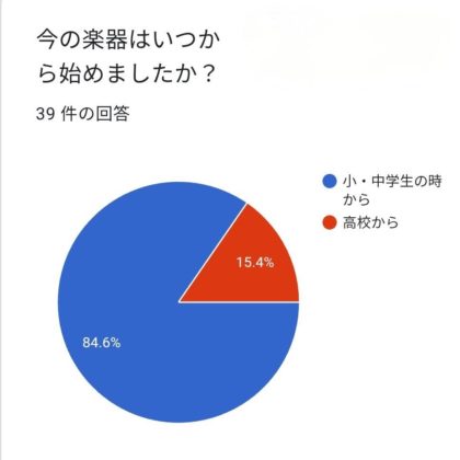 部員の15.4%の部員が、高校で楽器が変わった、あるいは高校から吹奏楽を始めたという結果になりました!今年度の1・2年生は、やや経験者の割合が高いですが、安心してください!もちろんOHSWOは、パートの先輩のみならず、同じ学年の部員でも、お互いに支え合いながらサポートしています!新しいことにチャレンジできる環境が整っているのですね!